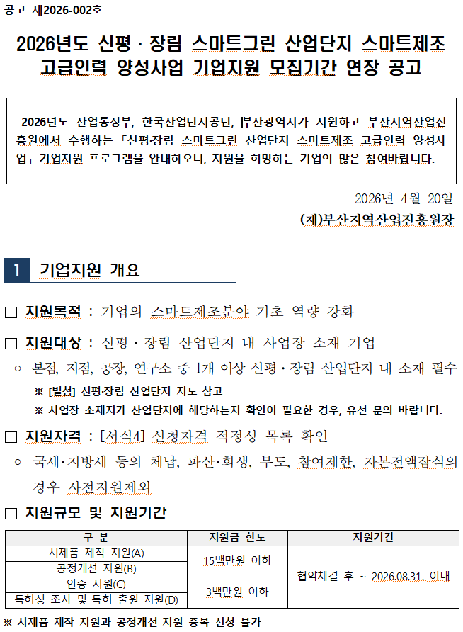 (공고 제2026-002호) 신평·장림 스마트그린 산업단지 스마트제조 고급인력 양성사업 기업지원 연장 공고