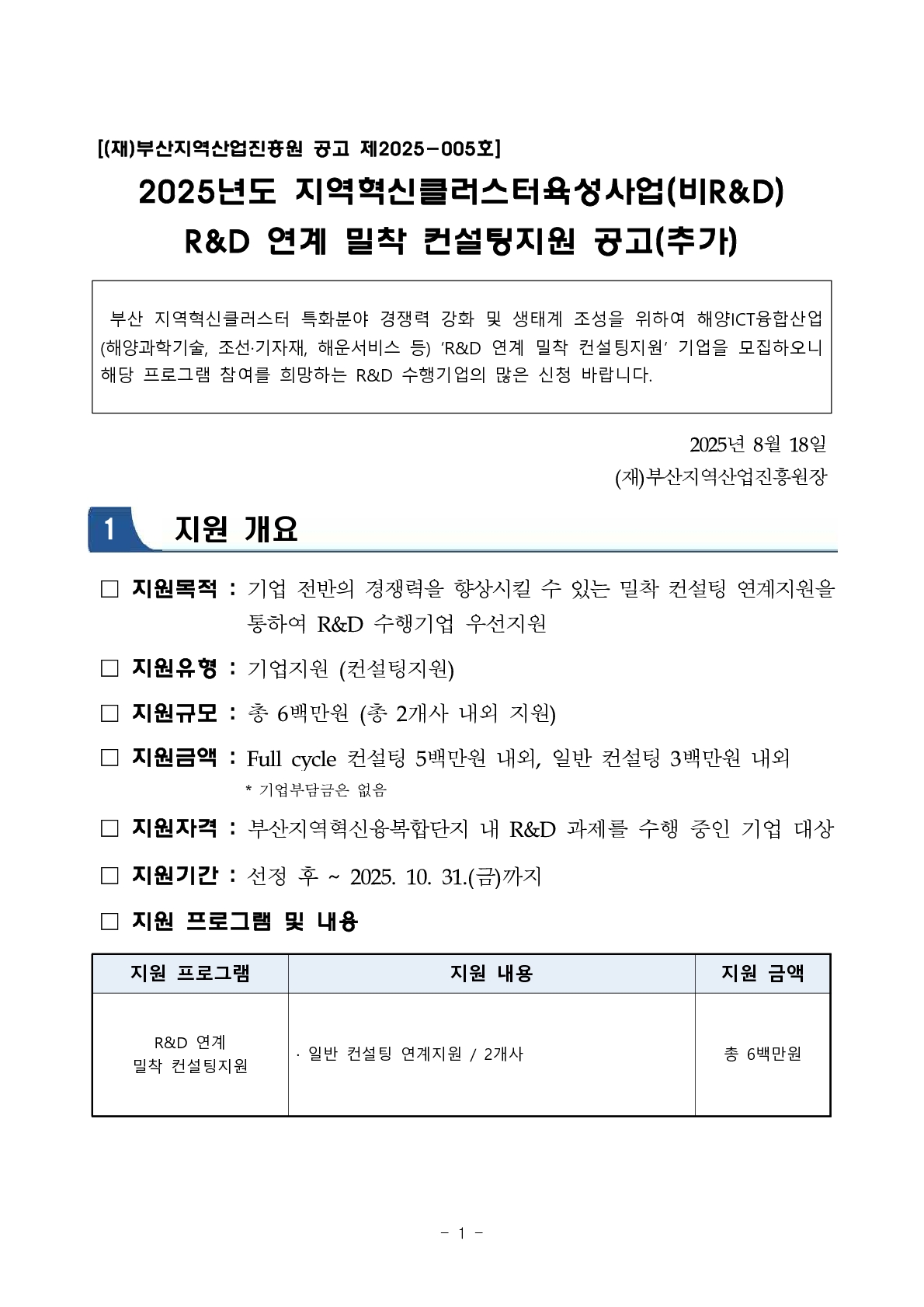 붙임. (공고 제2025-005호) 2025년도 지역혁신클러스터육성사업(비R&D) 기업지원(R&D 연계 밀착컨설팅) 모집 공고문(추가).pdf